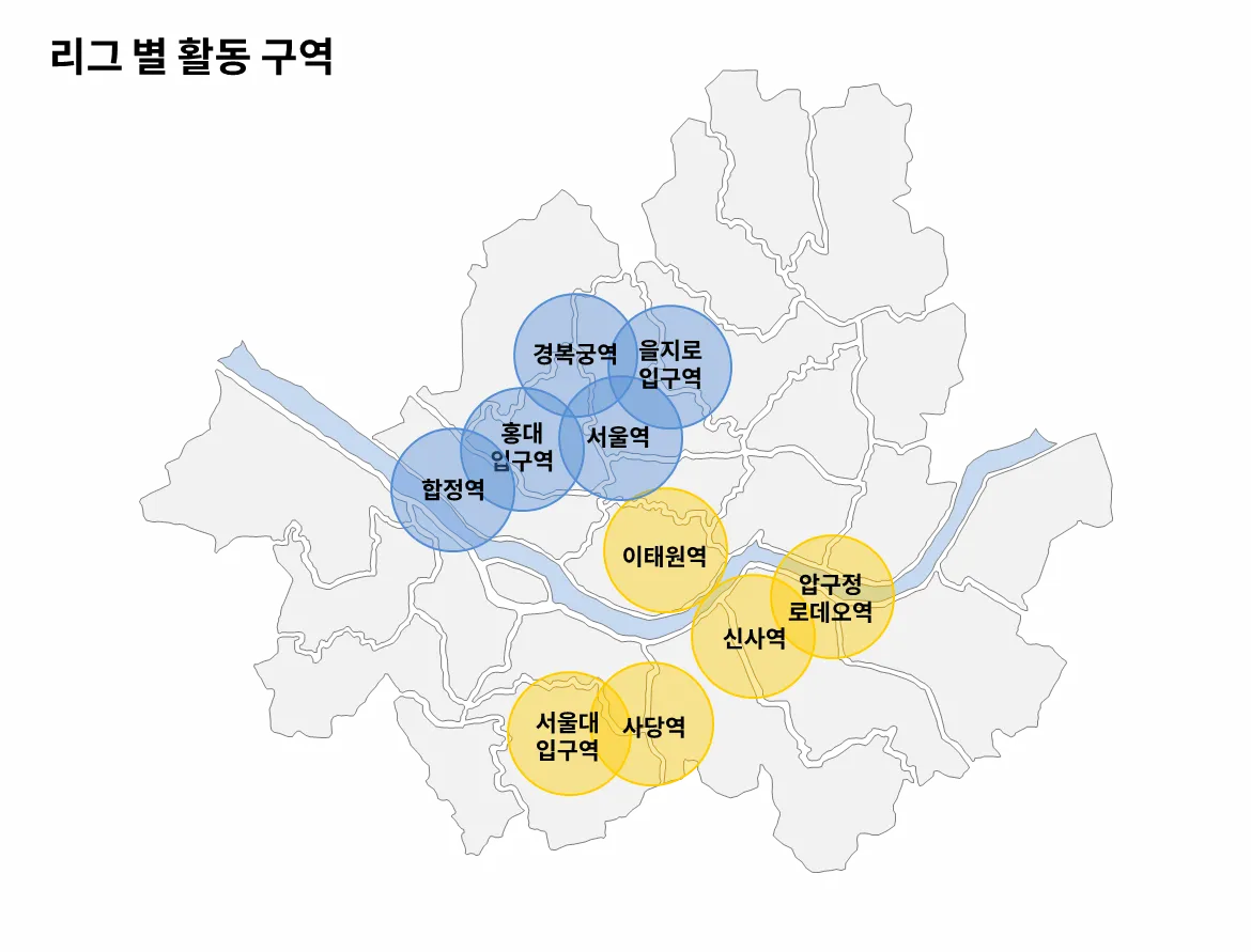 활동 권역을 블루리그, 옐로리그로 나누어 선택한 권역 내에서 활동해요