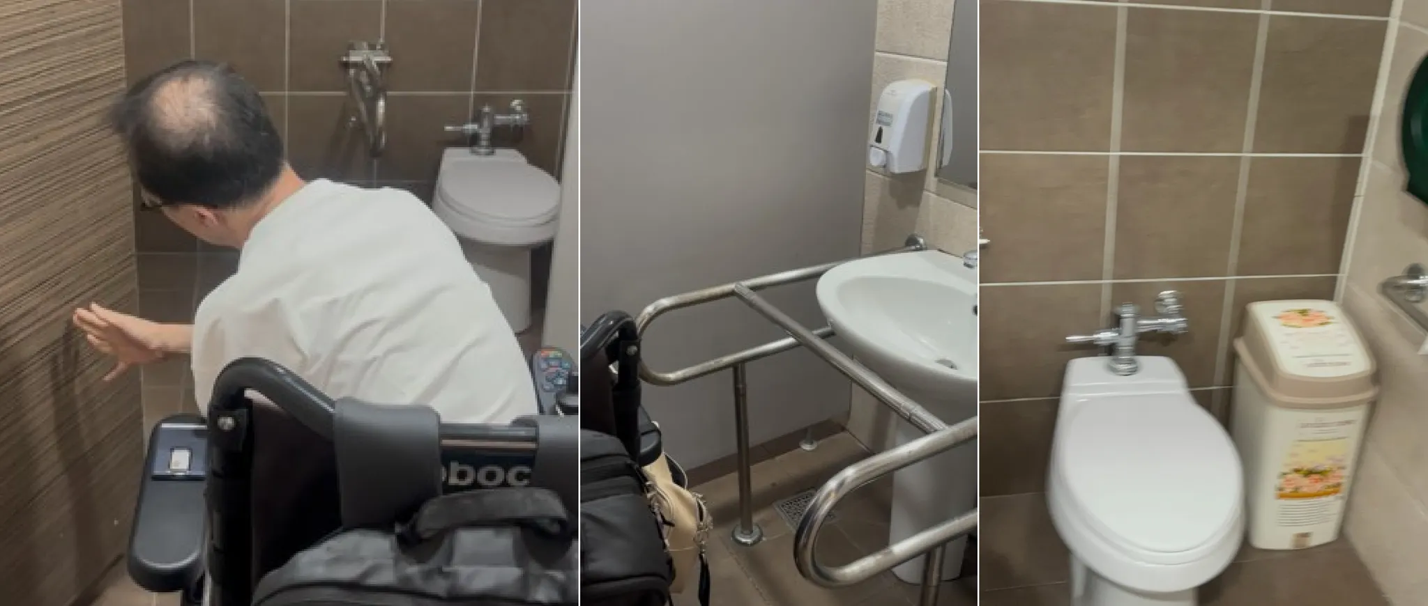 편의시설: 세면대 옆 손잡이 설치, 높이는 휠체어 사용에 적절.