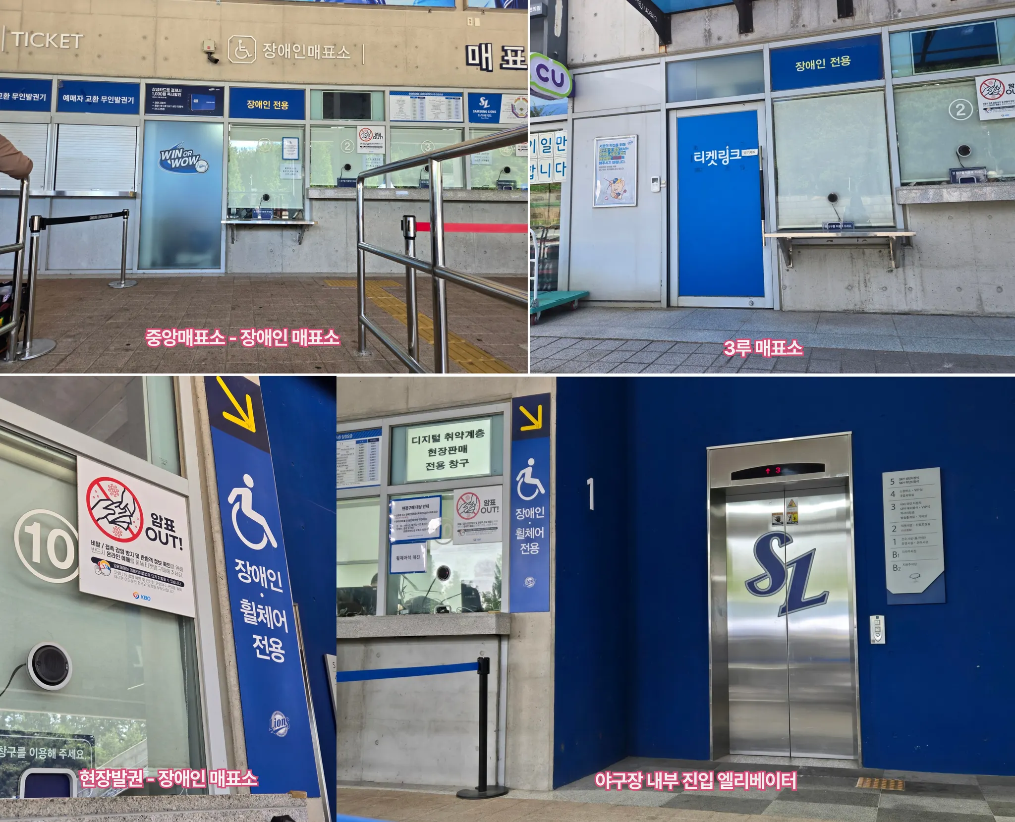 매표소: ① 3루 장애인 전용 ② 중앙 매표소 장애인 전용 ③ 디지털약자 현장발권 전용(당일 3석) ④ 주차장 쪽 1루 매표소