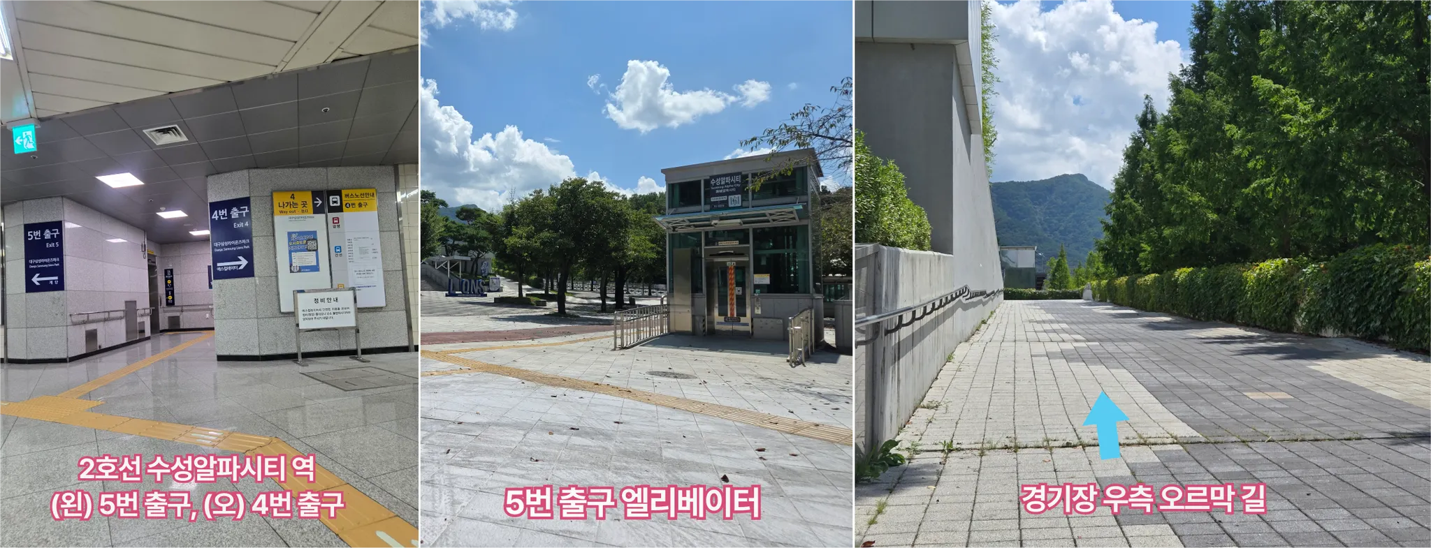5번 출구 엘리베이터 → 경기장 우측(오르막길, 전동휠체어 약 3분)