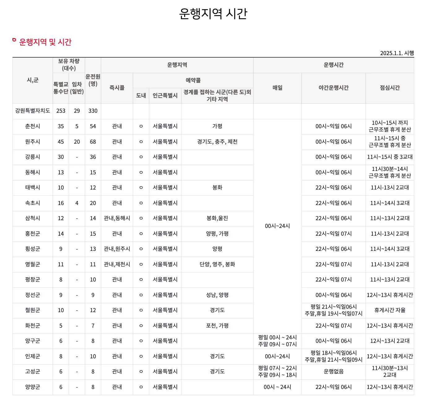 이용지역 | 춘천, 원주, 강릉, 동해 태백, 속초, 삼척, 홍천, 횡성, 평창, 정선, 철원, 화천, 양구, 인제, 고성군, 양양 |