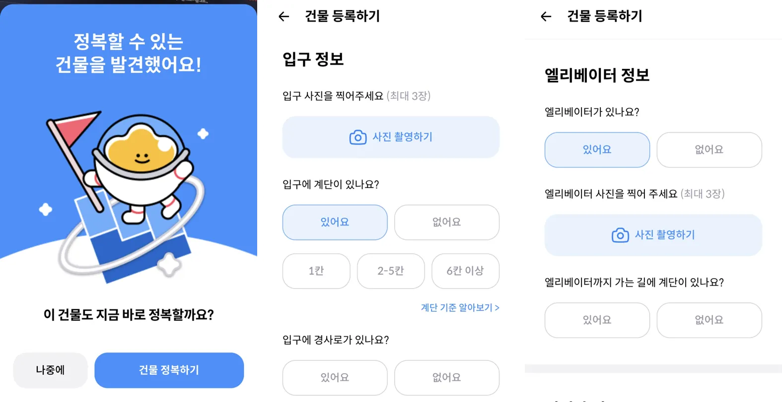 엘리베이터 정보: 건물 엘리베이터 유무, 엘리베이터 사진, 건물 입구로부터 엘리베이터까지 가는 길에 계단이 있는지 여부를 등록.