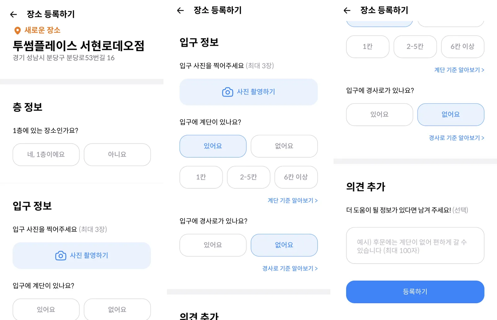 의견 추가: 이동약자 입장에서 도움이 될만한 정보를 입력(e.g. 실내가 넓고 쾌적해요, 자동문입니다, 엘리베이터 없는 건물 2층입니다 등)