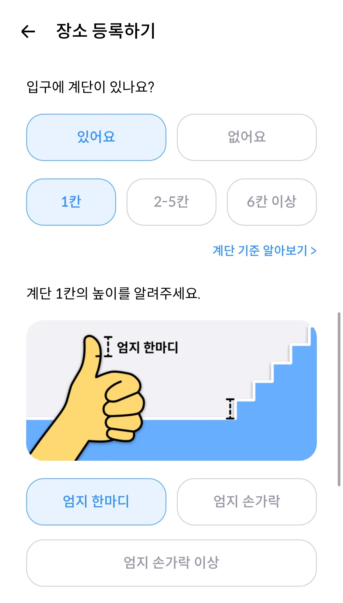 ‘아주 낮은 단차가 있는데 이것도 계단인가요? 엄지 손가락 한 마디 크기 이상은 계단으로 간주합니다. 엄지 손가락 한 마디 만큼의 단차도 누군가에게는 넘어가기 어려운 장벽이 되기 때문에 보수적인 기준으로 등록하고 있습니다.